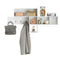 - Materiales: Madera MDF (E1), hierro y tela no tejida. Dimensiones: L100cm x D20cm x H31cm. Peso: 9,7 kg. Capacidad máxima: 15 kg. Montaje en pared rápido y fácil.